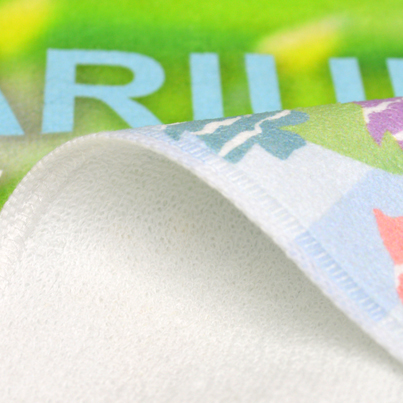 インクがタオルの繊維に入り込む昇華転写プリントなので、インクジェットプリントよりキレイに発色し、色落ちせずに長持ちします。またプリントタオルによくある版もなく、1枚から写真の他、繊細な文字やイラストもタオルにフルカラープリントできます。