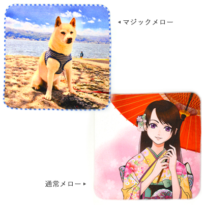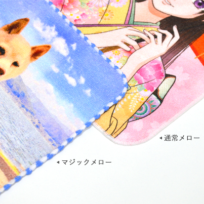 ハンカチの縁は、通常のメロー巻きの他、2色の糸を使用して模様にしたマジックメローが新しく選べるようになりました。シンプルなメロー巻き、装飾入りのマジックメローをお写真や贈る方に合わせてお選びいただけるのが嬉しいですね。メローの糸色はプリントデータに合わせたお任せとなります。