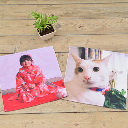 インクがタオルの繊維に入り込む昇華転写プリントなので、インクジェットプリントよりキレイに発色し、色落ちせずに長持ちします。またプリントタオルによくある版もなく、1枚から写真の他、繊細な文字やイラストもタオルにフルカラープリントできます。