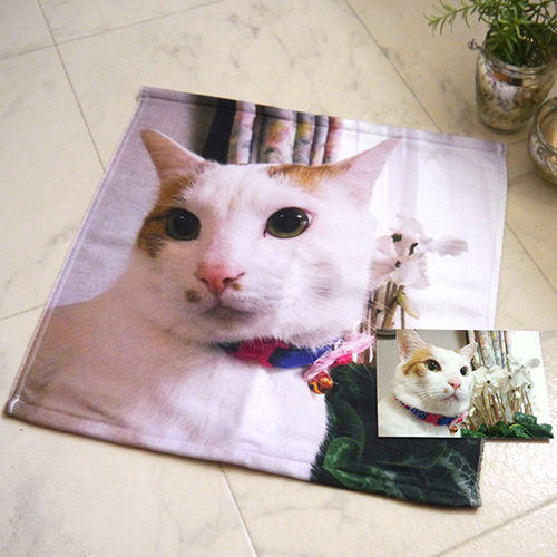 素材は、綿(コットン)を75%含みます。ポリエステル100%のマイクロファイバー素材と比べて肌触りがやわらかく、吸水性もあります。昇華転写プリントなので、インクジェットプリントよりキレイに発色し、色落ちせずに長持ちします。また版代なしで写真の他、文字やイラストもタオルにフルカラープリントできます。