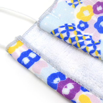 タオル生地の表面はパイルをカットたシャーリング加工を施しておりその上に、プリントいたします。プリント面はふんわりとした雰囲気になります。明るい色の柔らかいイメージのプリントが得意の生地です。裏面はコットンのふんわりとしたパイルになっており、やわらかく吸水性があります。 <実用新案取得>コットンを使用したタオルの肌触り等の質感を低下させず鮮明な昇華転写プリントができるのが特徴です。2018年12月に実用新案登録されました。