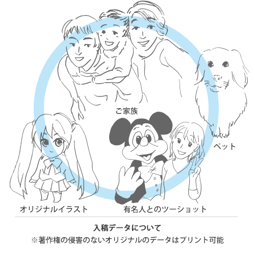 プリントする内容はオリジナルのものに限ります。第三者の著作権・肖像権(国内外のアイドルグループのメンバー・俳優・タレント・声優他、有名ブランドのロゴ・キャラクター、マンガ、アニメのキャラクター等)・商標権(Copyright表記・©マーク・™マーク・®マーク等)・意匠権・その他の法的権利を侵害しているまたは公序良俗に反するデザインについては個人使用に関わらず、権利者様または権利を譲渡された関係者様以外からの依頼はお受けできませんので、ご了承ください。また弊社が不適切と判断した場合、制作を中止する場合もございますのでご了承頂けますようお願い申し上げます。