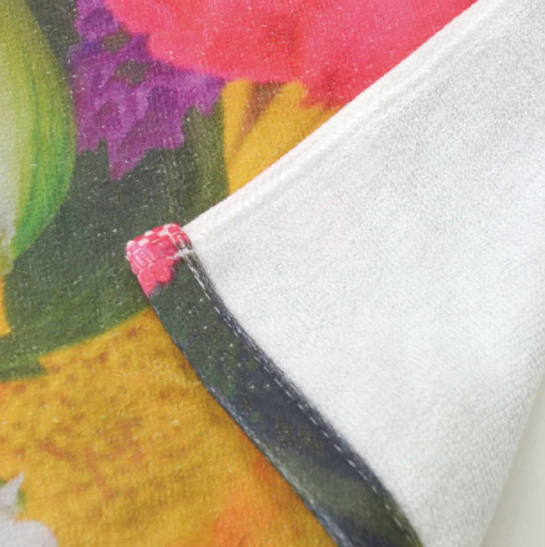 インクがタオルの繊維に入り込む昇華転写プリントなので、インクジェットプリントよりキレイに発色し、色落ちせずに長持ちします。またプリントタオルによくある版もなく、1枚から写真の他、繊細な文字やイラストもタオルにフルカラープリントできます。