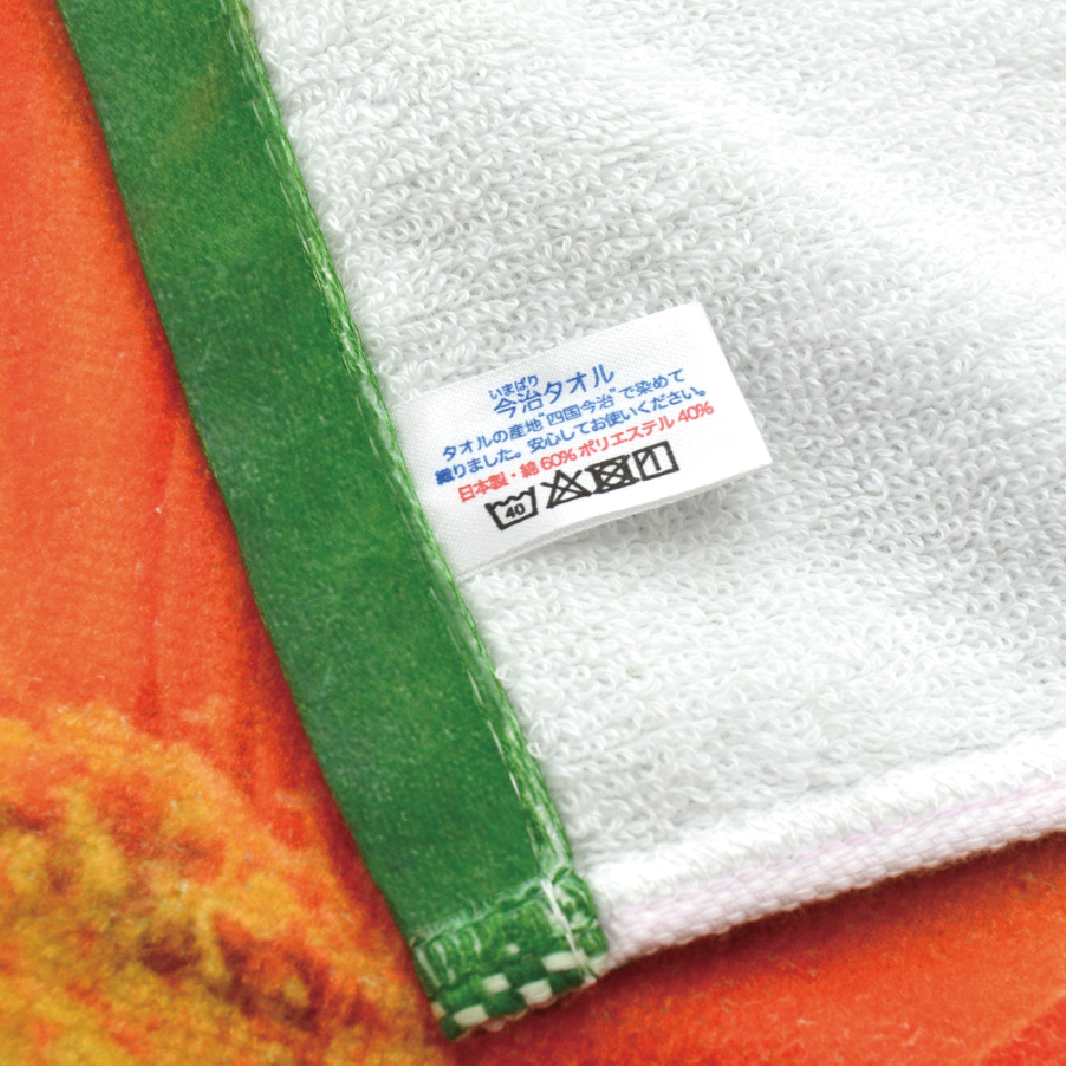 タオル生地に綿(コットン)を含む手触りの柔らかいタオルに仕上げました。ポリエステル100%のマイクロファイバー素材と比べて肌触りがやわらかく、吸水性もあります。タオルの織りからプリント、縫製まで全て日本一のタオル産地、愛媛県今治市にある1966年創業の唯一の自社工場で行っている安心の日本製タオルです。